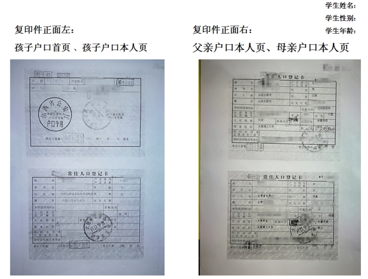 A4纸正面:左上:孩子户口首页; 左下:孩子户口本人页;