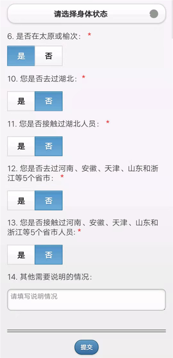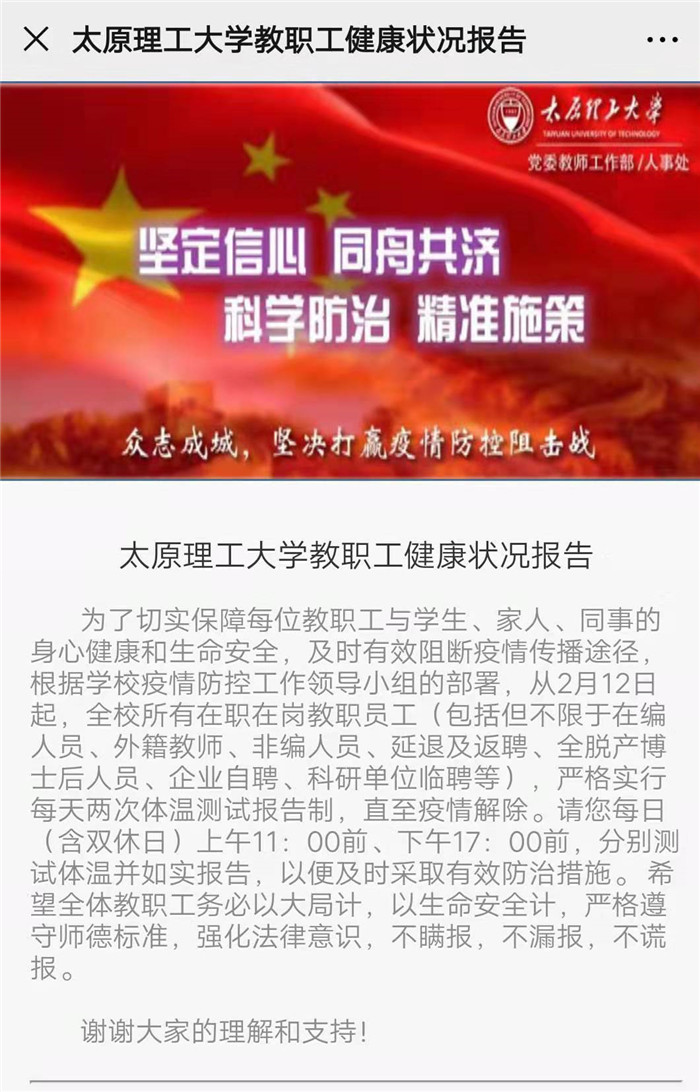 为了进一步做好疫情防控工作,全面落实“五严五防”举措,切实保障每位教职工与学生、家人、同事的身心健康和生命安全,及时有效阻断疫情传播途径,根据学校疫情防控工作领导小组的部署,按照教职工安全返程返岗、错峰(值岗)工作方案,212日起,全校所有在职在岗教职员工(包括但不限于在编人员、外籍教师、非编人员、延退及返聘、全脱产博士后人员、企业自聘、科研单位临聘等),严格实行每天两次体温测试报告制,直至疫情解除。