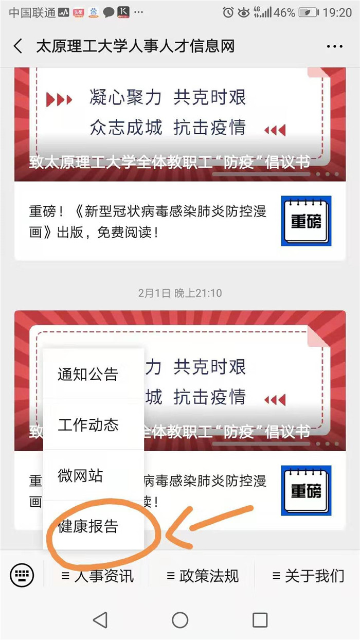2.进入公众号“人事资讯”中的下拉“健康报告”菜单项: