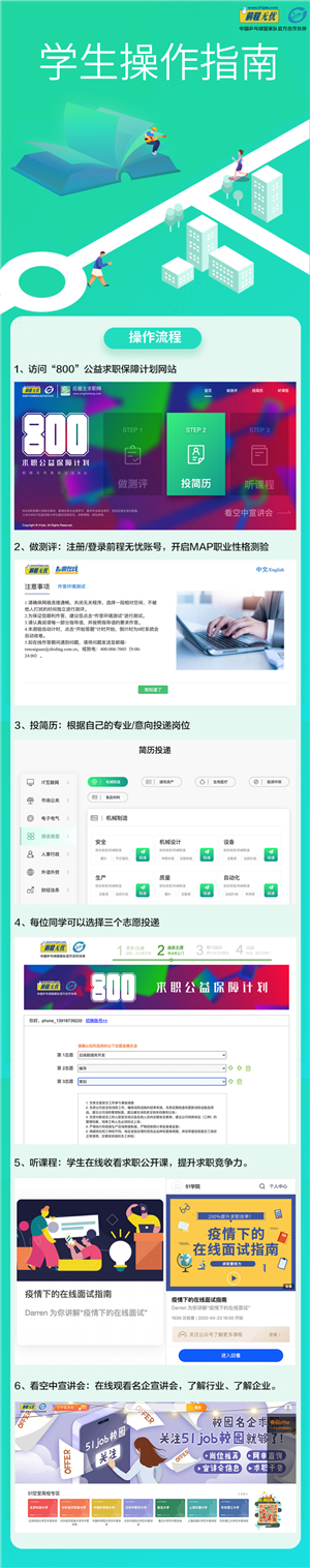 为深入学习贯彻习近平总书记关于就业工作的系列重要指示精神,积极稳妥组织毕业生校园招聘活动,落实山西省委省政府关于“稳就业、保就业”安排部署,促进浦京学生更充分、更高质量就业。学生处大学生就业服务中心组织浦京学生参加由前程无忧联合全国64所高校(第一批上线)和150余家企业背书(企业还在持续加盟中)组织的“‘800’求职公益保障计划”就业服务活动,请各学院组织同学们积极参与本次活动,具体安排如下: