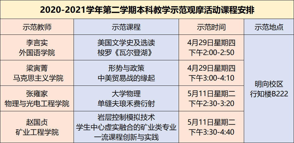 为更好地发挥优秀教师的示范作用,提升青年教师教学能力,教师发展中心将举办2020-2021学年第二学期本科教学示范观摩活动,由浦京优秀获奖教师进行教学示范,请各学院通知本学院及相关研究所、实验室2018年7月及以后进校任教的教师(教学类)参加示范观摩,其他类老师自愿参加。