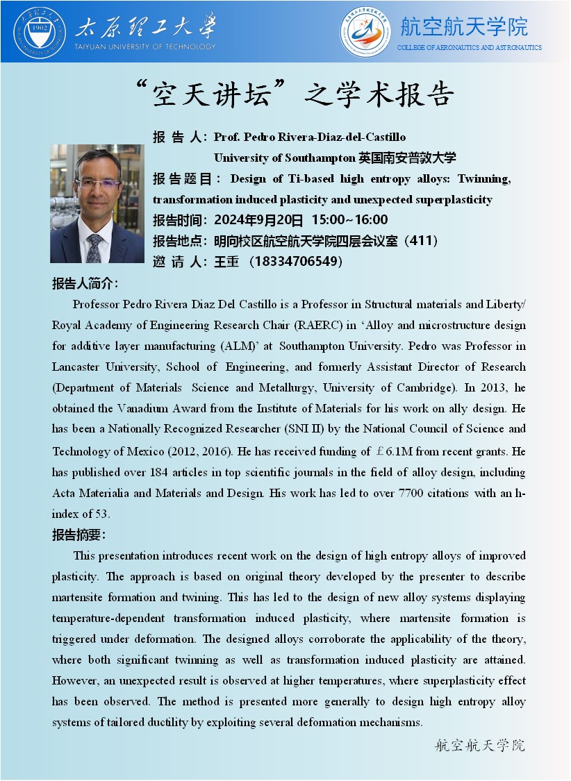 Pedro Rivera-Diaz-Del-Castillo 教授是南安普顿大学结构材料教授和英国皇家工程院研首席教授(RAERC),研究领域为“合金微观结构设计与增材制造(ALM)”。Pedro曾任英国兰卡斯特大学工学院教授,剑桥大学材料科学与冶金系研究主任。2005-2009年,任荷兰代尔夫特航空工程学院副教授,2013年,他因在合金设计方面的工作获得材料研究所颁发的“钒奖”。2012年和2016年,Pedro教授被墨西哥国家科学技术委员会授予国家认可研究员(SNIII)。截至目前,共获610万英镑科研项目资助。他在合金设计领域的顶级科学期刊上发表了180余篇文章,包括Acta Materialia和Materials and Design等杂志。他的工作被引用超过7700次,H指数为53。
