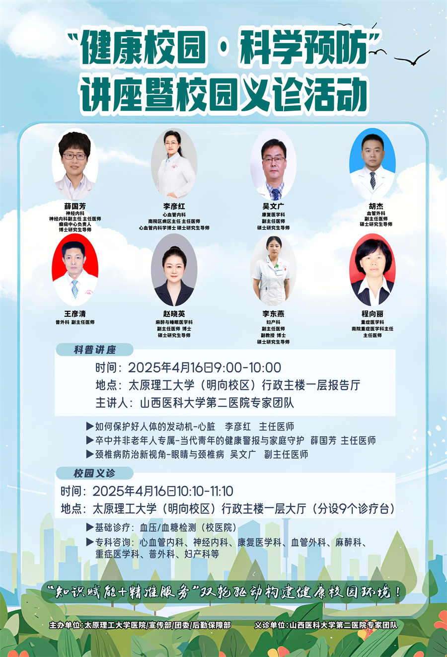 为积极响应国家“健康中国2030”战略,落实“体重管理年”行动。贯彻校党政“为师生服务”工作部署,切实将“以学生为中心,以教师为根本”的发展理念转化为实际行动,全面提升师生健康素养。经多方积极联系和筹备,特邀山西医科大学第二医院专家团队联合开展“健康校园·科学预防”专题健康教育活动。定于2025年4月16日举办“健康讲座+现场义诊”一体化健康促进活动。现将具体事项通知如下: