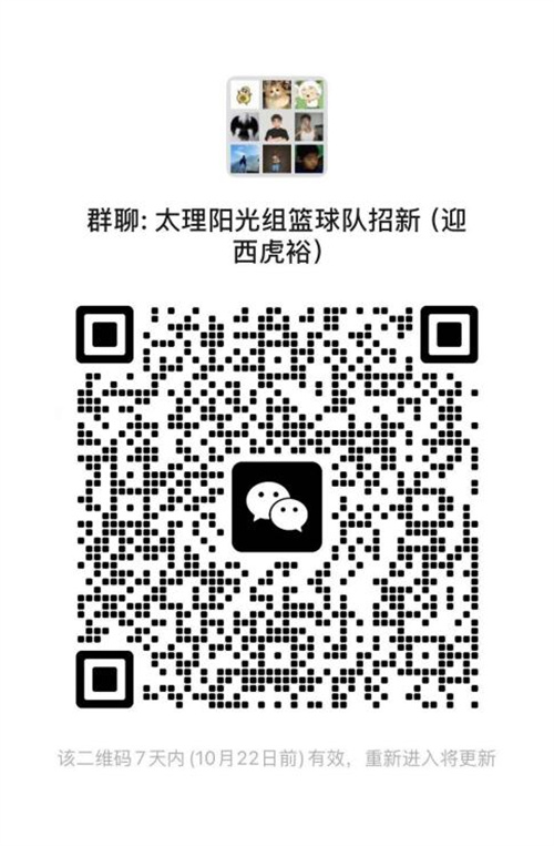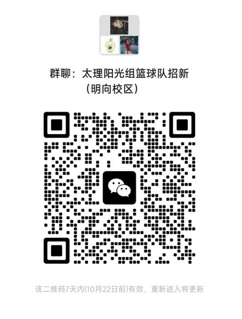报名方式:符合招募条件的学生请下载并填写《350vip浦京集团官网阳光组篮球队报名表》(附件 ),按要求提交至指定邮箱,同时加入阳光组篮球队报名咨询群(群二维码见附件),以便及时获取报名、选拔相关信息。