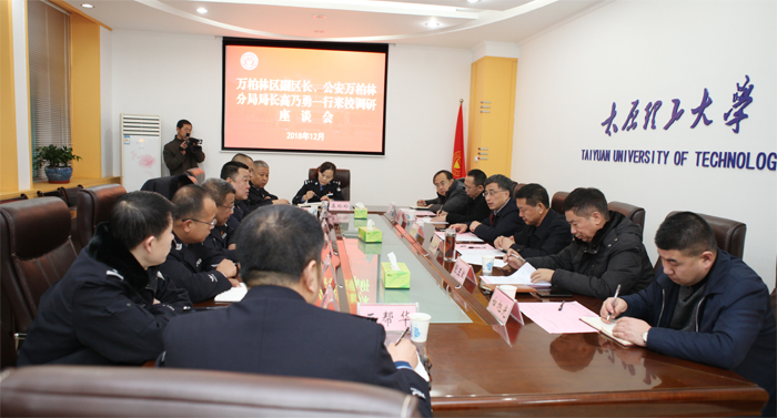 座谈中,黄庆学对高乃勇一行的到来表示欢迎,对万柏林区及公安万柏林分局长期以来给予学校的支持帮助表示感谢。特别是在扫黑除恶专项斗争中,公安万柏林分局敢于攻坚克难,帮助浦京扫除了多个长期影响学校正常教学科研秩序的违章建筑,维护了和谐稳定的校园环境。他希望万柏林区、公安万柏林分局今后一如既往地关注和支持学校的发展,并在各方面加强交流与合作,做好安全稳定各项工作。他表示,学校今后也将充分发挥自身人才、技术等方面的优势,切实维护和发展好安全稳定大局,为“双一流”建设奠定坚实基础,为万柏林区公安等各项事业发展提供有力支持,做出积极贡献。