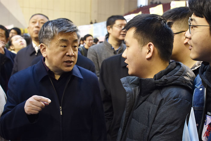 吴玉程在招聘会现场了解了各类型用人单位的人才需求情况、招聘方向以及具体招聘情况,希望学校能与更多优秀企业开展长期深入的合作与交流。他与在场的毕业生亲切交谈,鼓励毕业生树立积极就业观,合理选择就业岗位,主动自信参与面试,规划好自己的就业前景。