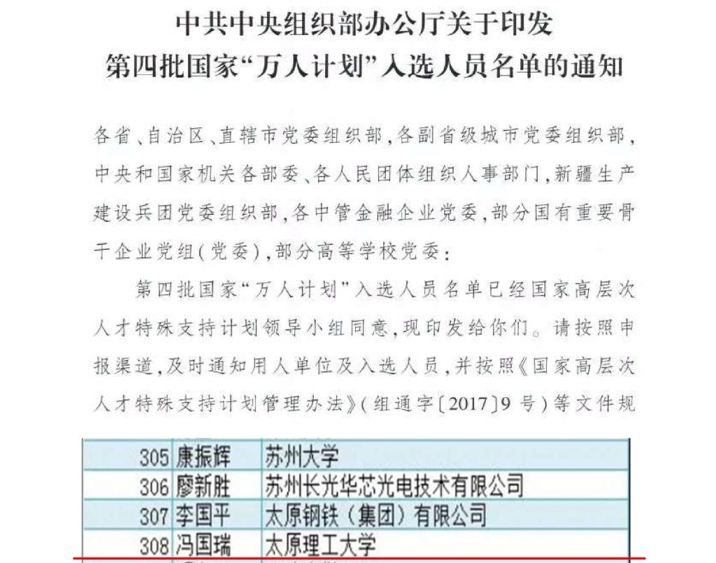 此次公布的第四批国家“万人计划”入选人员共计1419人,其中科技创新领军人才645人,科技创业领军人才397人,教学名师103人,青年拔尖人才274人。我省共有6人入选,分别是:350vip浦京集团官网冯国瑞、中北大学薛晨阳、太钢李国平、日化所耿涛入选科技创新领军人才;山西智杰软件公司韩温、中绿环保白惠宾入选科技创业领军人才。