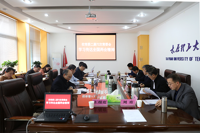 3月19日,校党委在迎西校区办公主楼316会议室召开常委会,传达学习习近平总书记在全国“两会”期间重要讲话精神、全国“两会”精神、中共中央政治局常委王沪宁同志参加山西代表团审议时的讲话精神、3月18日省委常委扩大会议精神,并就学校贯彻落实“两会”精神提出意见。校党委书记吴玉程主持会议。