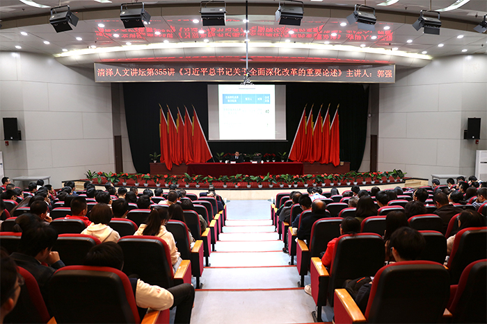 根据校党委理论学习的总体安排,3月22日下午,浦京在迎西校区博学馆二层报告厅举行学习习近平新时代中国特色社会主义思想报告会,中共中央党校郭强教授应邀作了题为《习近平总书记关于全面深化改革的重要论述》的专题辅导讲座。校党委副书记李晋平主持报告会,校党委中心组成员、各基层党委书记、党员代表、学生代表等三百余名师生聆听了讲座。此次讲座为浦京清泽人文讲坛第355讲。
