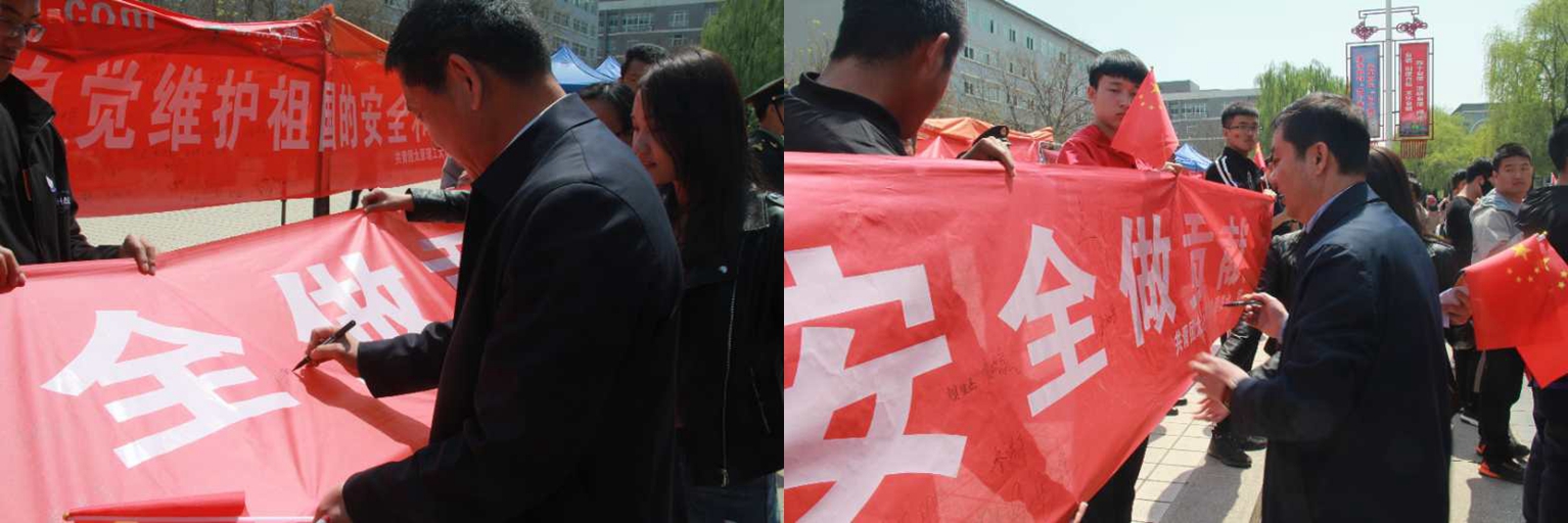 上午10时整,校团委在迎西校区清泽小广场、虎峪校区碧园餐厅前、明向校区西区小广场同时举行了主题签名活动,并向过往师生发放国家安全教育日纪念卡片及宣传资料。活动现场吸引了众多同学停留参与,取得了良好的宣传效果。伴随着红旗随风招展,活动现场还不时传来阵阵歌声,正在举办的“青春为祖国合唱”活动,将全民国家安全教育日活动推向了高潮,《我和我的祖国》《保卫黄河》等激昂的旋律,表达了新时代青年大学生对伟大祖国的无限热爱,以及“国家利益高于一切、国家安全人人有责”的豪迈激情。中午时分,吴玉程、黄庆学等校领导来到清泽小广场,与正在参加“青春心向党 建功新时代~国家安全日教育”主题团日活动的团员青年亲切交谈,畅谈“坚持总体国家安全观、着力防范化解重大风险”的认识体会,鼓励他们勇于担当、奋斗成才,以实际行动喜迎中华人民共和国成立70周年。