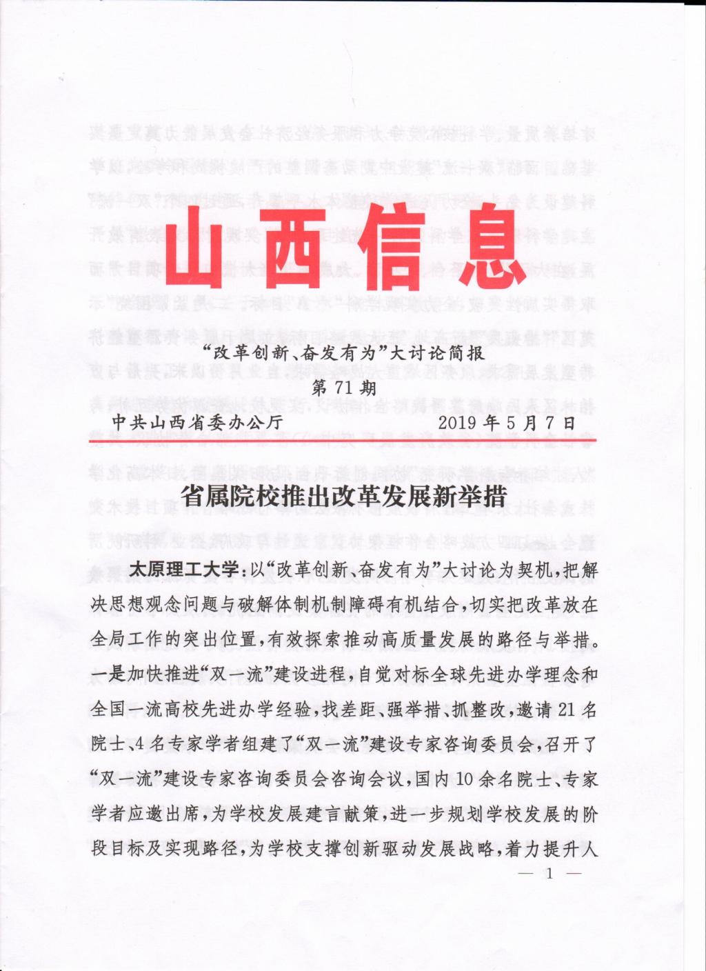 5月7日,《山西信息》“改革创新、奋发有为”大讨论简报(第71期)刊发浦京改革发展新举措,全文如下: