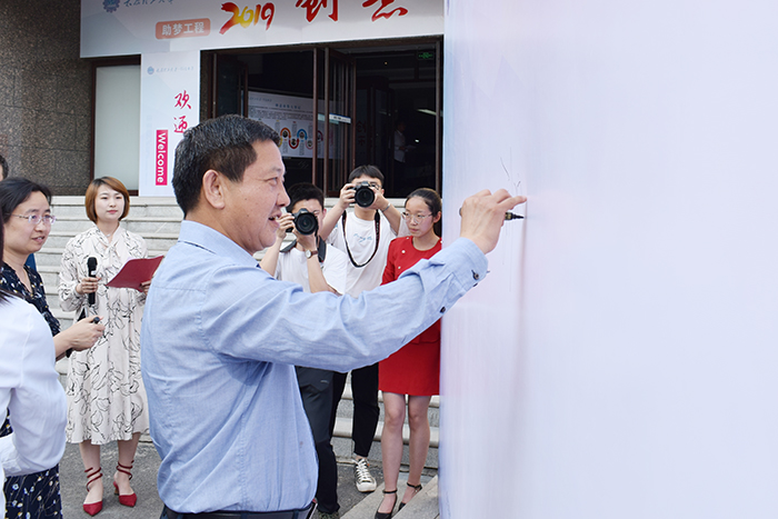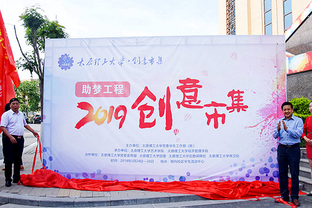 启动仪式上,刘润祥与学生处负责人共同为2019年助梦工程——创意市集揭幕,并签名留念。