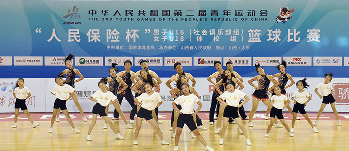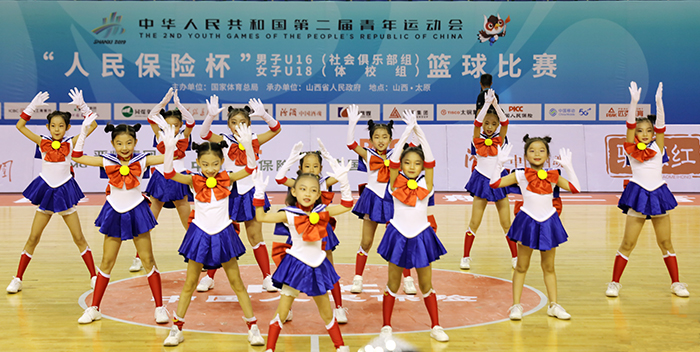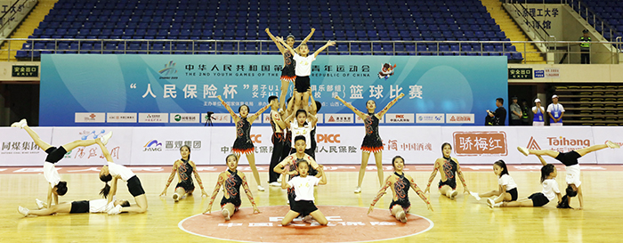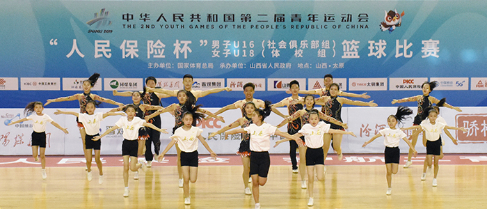 第二届全国青年运动会篮球男子篮球项目男子U16俱乐部组决赛在浦京迎西校区体育馆如火如荼地进行着,比赛中,双方队员激烈角逐,比赛间隙,活力四射的啦啦操队员为运动员和观众们送上不一样的视觉盛宴。