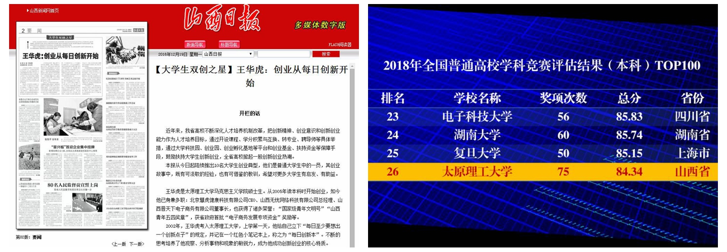 学校创新创业工作得到了广泛认可,光明日报、中国教育报、中国青年报、人民网、新华网、山西日报等多家媒体多次对学校创新创业工作和优秀人物进行了报道。近年来,学校先后入选全国首批“深化创新创业教育改革示范高校”、科技部“国家创人才培养示范基地”、教育部第三批“全国高校实践育人创新创业基地”和山西省首批“双创示范基地”。近三年获得全国“互联网+”大赛银奖2项、铜奖3项;获得“创青春”大赛银奖1项,铜奖3项。2018年获得全国大学生电子商务“创新、创意及创业”挑战赛特等奖2项,一等奖2项;学校涌现出一批以杨宇鹏、王华虎和于盛旺博士团队为代表的师生创新创业典型。2018年,浦京在中国高等教育学会发布的《全国普通高校学科竞赛评估TOP100》排行榜中位列第26位。