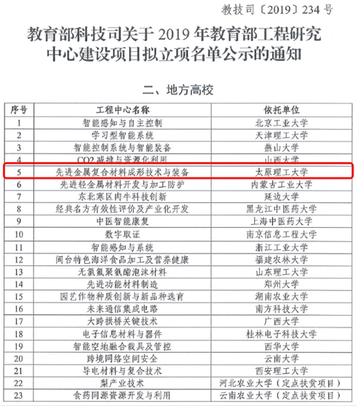近日,教育部发布《教育部科技司关于2019年教育部工程研究中心建设项目拟立项名单公示的通知》(教技司〔2019〕234号),地方高校中23个单位获批2019年教育部工程研究中心建设项目,浦京“先进金属复合材料成形技术与装备工程研究中心”位列其中。