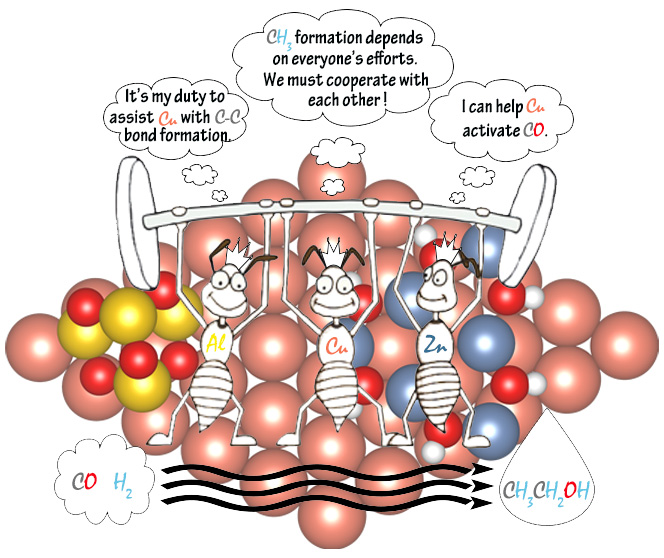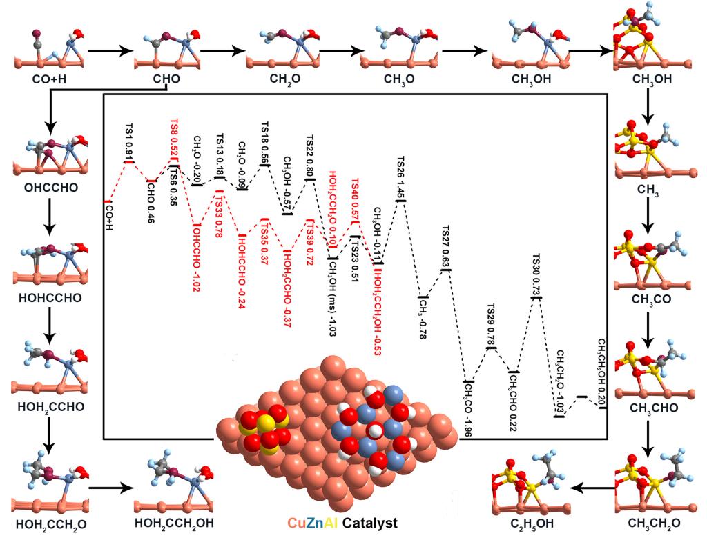 作为有前景的绿色替代能源,乙醇在车用汽油添加剂和燃料电池氢载体领域表现出巨大的潜力。众所周知,CuZnAl是工业甲醇合成催化剂,长期以来从未被发现具有明显的乙醇合成能力。黄伟教授团队在前期实验研究中发现采用自主发明的完全液相法制备的CuZnAl浆状催化剂具有显著的合成乙醇能力,最好的结果乙醇选择性在全部产品中可达40%以上,然而其乙醇生成机理和各组分的作用尚不清晰。