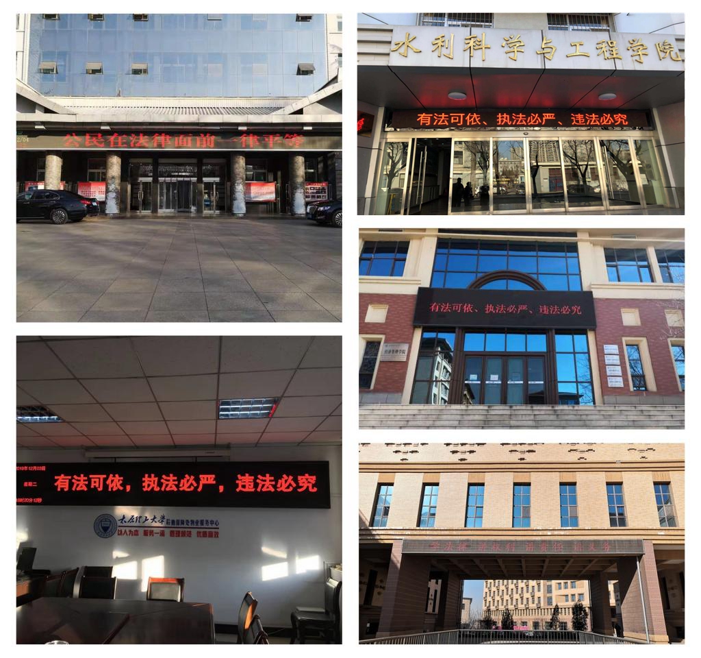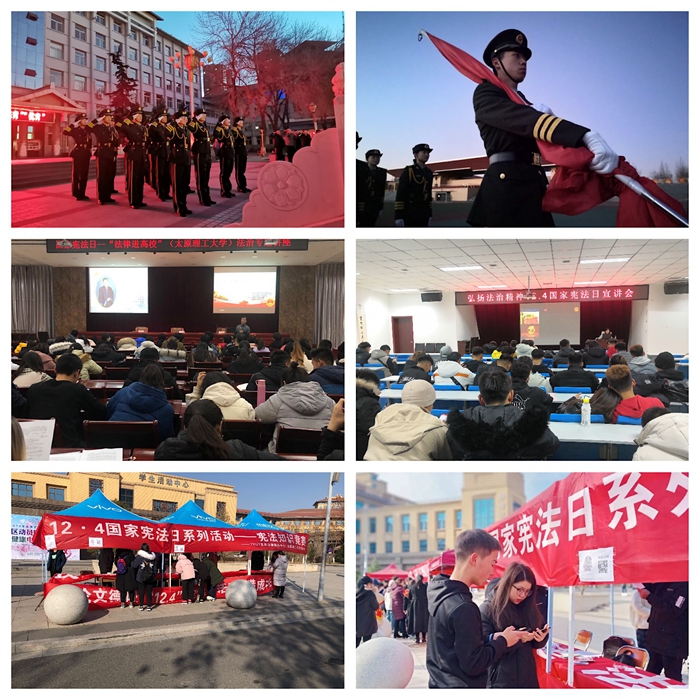 在此期间,校团委、文法学院联合开展了“宪法知识竞赛”;校团委特邀千峰司法所所长王剑芳、山西军秉律师事务所主任李军作了专题讲座,组织“国旗护卫队”80名队员在国旗下晨读宪法;体育学院召开弘扬法治精神“12•4”国家宪法日宣讲会;文法学院举办了“手抄宪法100”活动、“我为宪法献我心”的签名活动和宪法知识竞赛系列活动;艺术、水利、经管、后勤系统等14家基层单位利用电子屏广泛宣传宪法口号和知识,开展了丰富多彩的普法宣讲活动。