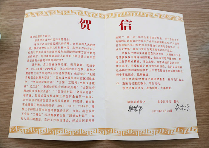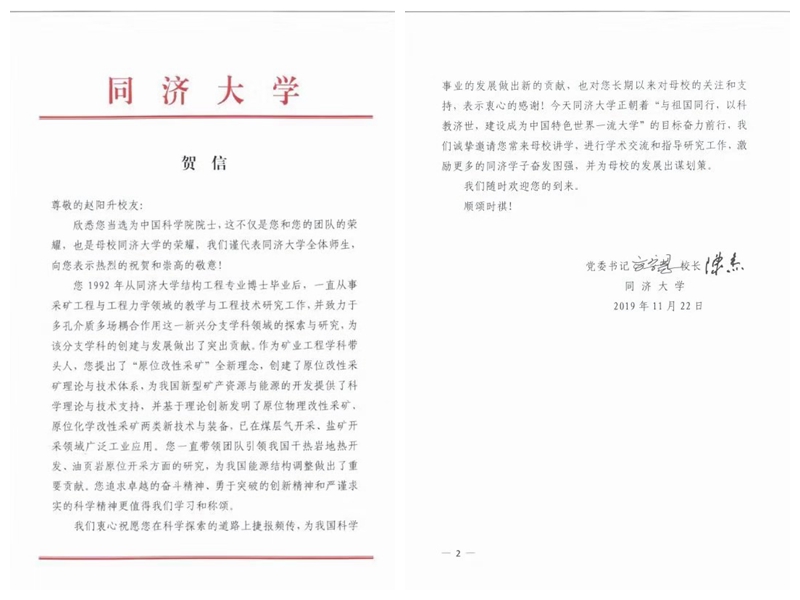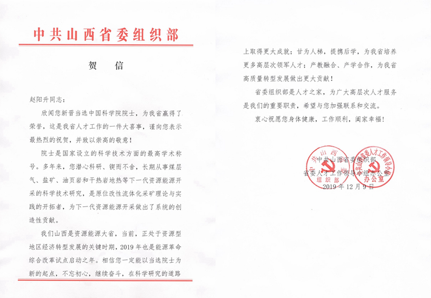赵阳升教授当选中国科学院院士的消息公布以来,山西省政协副主席谢红及部分院士、专家、学者等通过电话、短信等形式向赵阳升院士表达热烈祝贺,同济大学、阳曲县、太原科技大学、辽宁工程技术大学等相关单位也发来贺信表示祝贺。