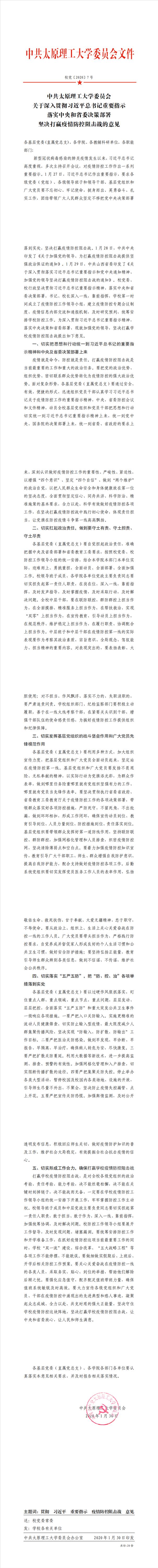 《意见》指出,新型冠状病毒感染的肺炎疫情发生以来,习近平总书记高度重视,多次主持召开会议,对疫情防控工作作出一系列重要指示。1月27日,习近平总书记作出重要指示,要求各级党委(党组)、各级领导班子和领导干部、基层党组织和广大党员要不忘初心、牢记使命,挺身而出、英勇奋斗、扎实工作,团结带领广大人民群众坚定不移把党中央决策部署落到实处,坚决打赢疫情防控阻击战。1月28日,中共中央印发了《关于加强党的领导、为打赢疫情防控阻击战提供坚强政治保证的通知》。1月29日,中共山西省委印发了《关于深入贯彻落实习近平总书记重要指示和党中央通知精神、加强党的领导坚决打赢疫情防控阻击战的通知》。校党委、校行政坚决贯彻习近平总书记重要指示精神,落实中央和省委决策部署,书记、校长深入一线,靠前指挥,学校第一时间成立了疫情防控工作领导小组,建立疫情防控专题会议制度、疫情信息内部交流和通报机制,及时研究预判、统筹安排学校防控工作。