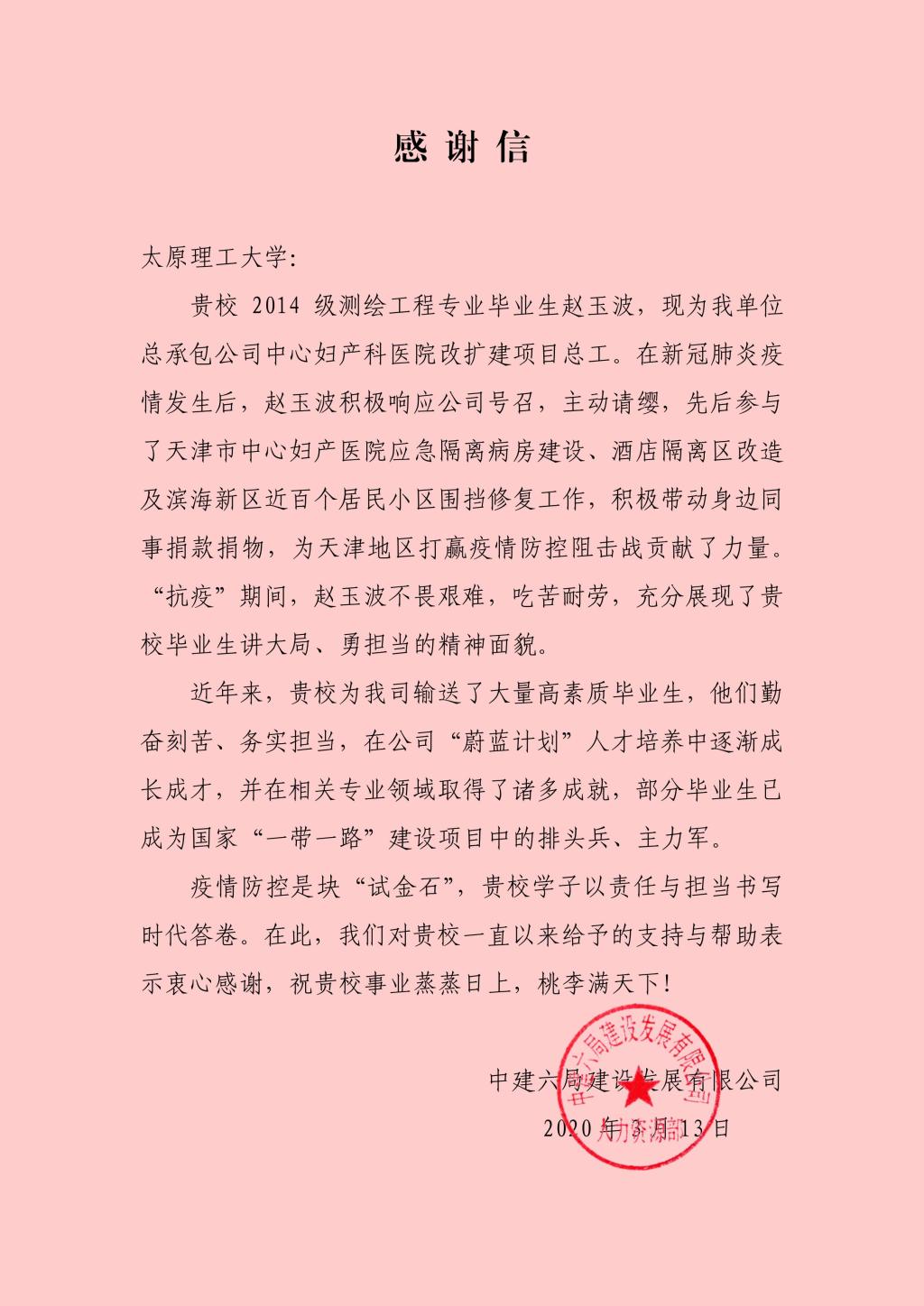 近日,中建六局建设发展有限公司给浦京发来感谢信,信中不仅肯定了浦京2014级测绘工程专业毕业生赵玉波在该单位的优秀表现和在此次疫情防控中的辛勤付出,也对浦京多年来输送大量高素质毕业生和对高等教育人才的精心培育表示感谢。这封感谢信,是用人单位对浦京人才培养的一次肯定,同时也是近年来浦京高度重视就业质量和立德树人工作成果的一个缩影。