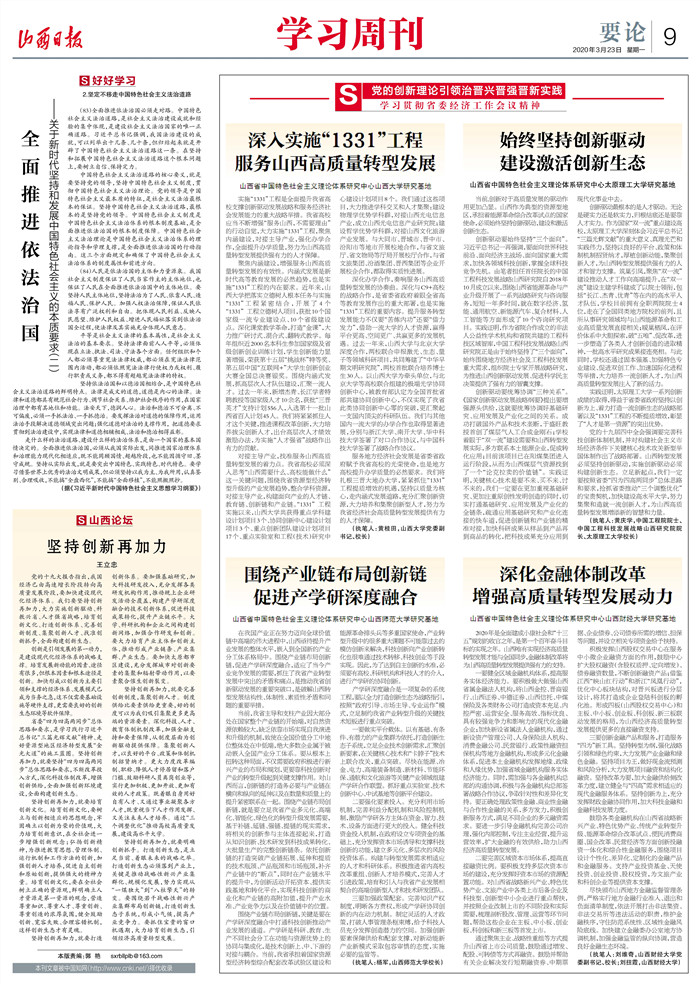 3月23日,由校长黄庆学执笔撰写的题为《始终坚持创新驱动 建设激活创新生态》的文章在《山西日报》学习周刊发表。应中共山西省委宣传部的约稿邀请,该篇文章主要围绕“实施创新驱动,提升企业技术创新能力”撰写,系山西省中国特色社会主义理论体系研究中心350vip浦京集团官网研究基地的一项重要理论成果。