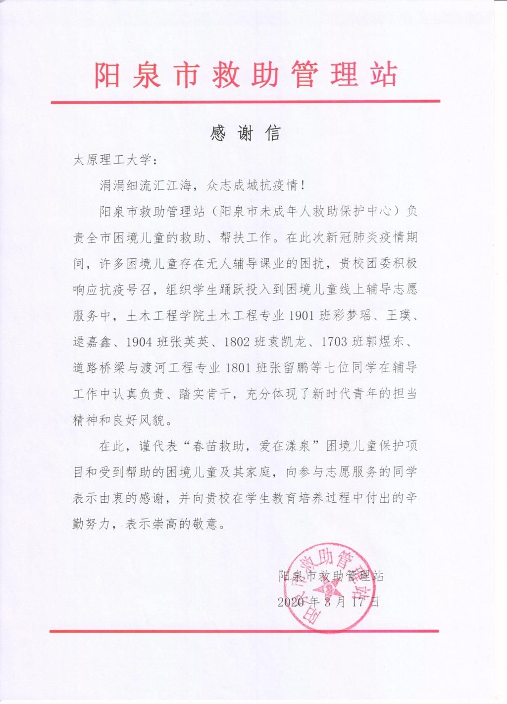 感谢信中说,七位同学在辅导工作中认真负责、踏实肯干,充分体现了新时代青年的担当精神和良好风貌,阳泉市救助管理站代表“春苗救助,爱在漾泉”困境儿童保护项目和受到帮助的困境儿童及其家庭,向参与志愿服务的同学表示由衷感谢,并向浦京在学生教育培养中付出的辛勤努力表示崇高敬意。