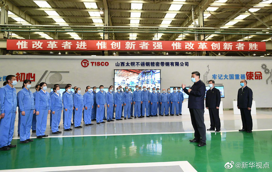 随后,习近平前往太钢不锈钢精密带钢有限公司考察调研。这家企业依托先进生产工艺,以其“超薄、超平、超硬”的产品特性取得快速发展。习近平走进生产车间,察看企业转型升级产品展示,了解企业运行情况。在光亮机组前,习近平饶有兴致地观看了厚度仅有0.02毫米的不锈钢箔材“手撕钢”产品。习近平指出,产品和技术是企业安身立命之本。希望企业在科技创新上再接再厉、勇攀高峰,在支撑先进制造业发展方面迈出新的更大步伐。现在,全国防疫工作进入新阶段,既取得重大战略成果,同时面临外防输入、内防反弹的压力,希望企业不要麻痹松懈,继续抓紧抓实抓细各项防控措施,更好复工复产,做到安全生产、健康生产,把失去的时间抢回来,努力完成今年的目标任务。