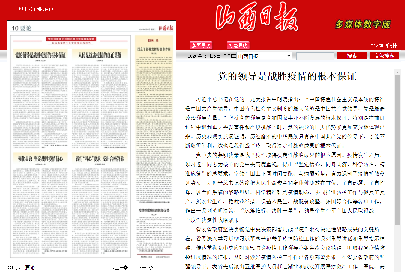 6月16日,由校党委书记郑强执笔撰写的题为《党的领导是战胜疫情的根本保证》的文章在《山西日报》学习周刊发表。