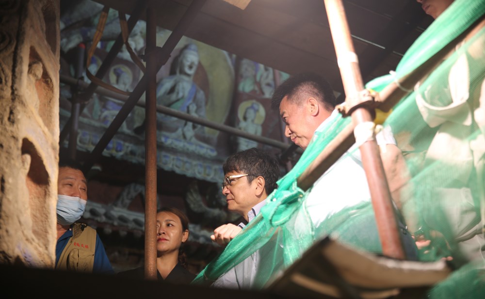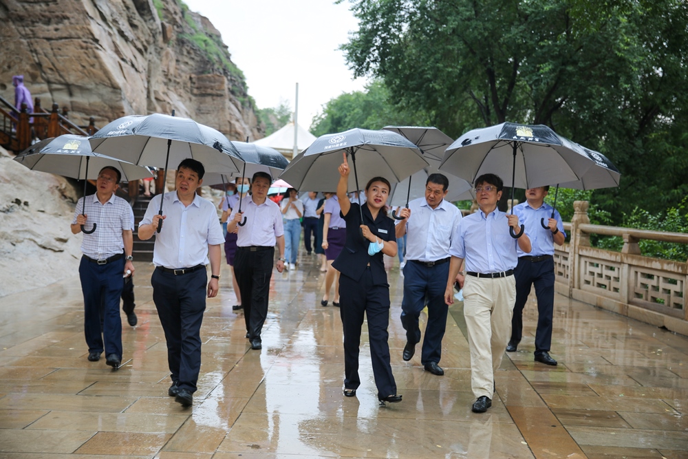 郑强一行首先冒雨来到云冈石窟调研。在聆听了云冈石窟研究院负责人王雁翔、崔晓霞的介绍后,郑强详细了解了石窟的开凿历史和保护情况,并与五华洞保护工程现场的工作人员深入交流探讨如何提升石窟保护质量。郑强表示,云冈石窟作为世界文化遗产,造像气势宏伟,内容丰富多彩,是古代雕刻艺术的宝库,学校将充分发挥学科专业优势,进一步加强与云冈石窟研究院的合作,共同开展文物保护与修复工作。