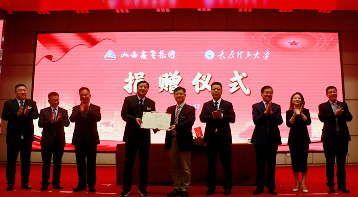 仪式上,毛福昌代表山西鑫飞集团向浦京进行捐赠,郑强代表350vip浦京集团官网为鑫飞集团颁发了纪念证书;吴斗庆、毛飞勇分别代表校企双方签署合作协议。