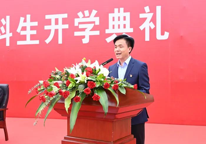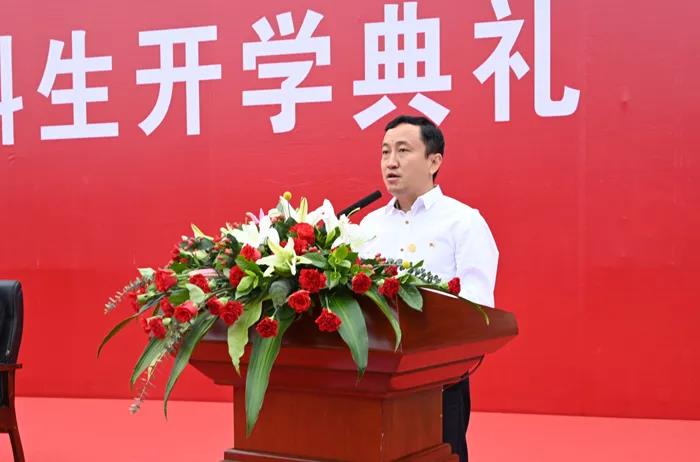 开学典礼在庄严的国歌声中拉开帷幕。黄庆学对新同学的到来表示欢迎,并作了题为《奋斗没有终点 勤奋成就人生》的讲话,勉励大学生要树立远大理想,做一个志存高远的新时代青年;要保持奋斗激情,做一个勤奋学习的新时代青年;要勇于深入实践,做一个知行合一的新时代青年。他指出,理想既是努力奋斗的目标,更是不懈追求的方向。同学们生逢盛世一定要不负盛世,在实现“两个一百年”奋斗目标的征途上,立鸿鹄志、做奋斗者,为中华民族伟大复兴的中国梦增添光彩。他强调,奋斗的人生最幸福。大学阶段是构建专业知识体系、夯实基础知识的重要时期,大学是求得真学问、练就真本领的学术殿堂。希望大家尽快适应大学的学习生活,用心感受大学生活的真谛,找准努力的方向,聚精会神、心无旁骛地学;用脑思考大学生活的深刻内涵,切中成长的脉搏,在不断探索中学;用手随时记录好大学的点点滴滴,厚积而薄发,勤于动手,在创新创造中学;用脚丈量大学生活的外延,在实践中学。