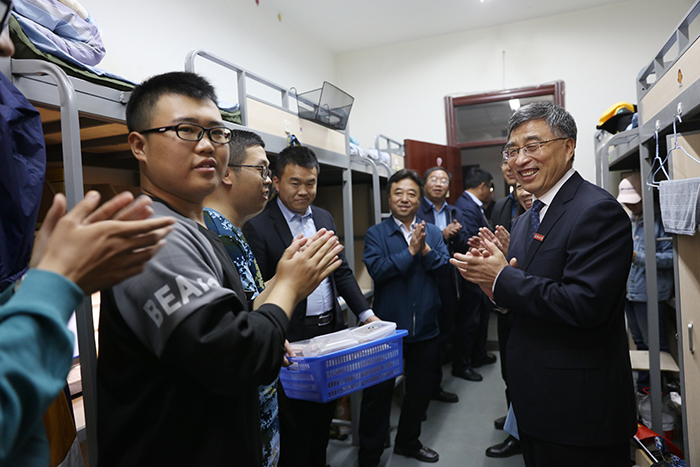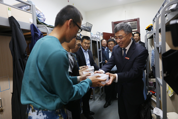 走进学生宿舍,黄庆学代表学校向同学们表达了国庆节、中秋节的诚挚问候和美好祝福,向大家送上月饼,并与同学们亲切交谈,关切地询问大家来自哪里和近期的学习生活情况,赞扬大家在军训中表现出的吃苦耐劳坚强品质,叮嘱大家在校期间多给远方的家人报平安。“宗复学院是培养拔尖创新人才的摇篮,是学校教学教育改革的试验田。你们是全校新生中的佼佼者,一定要在未来的学习中成为标杆,成为学校创新人才培养的一面旗帜,将来努力成长为德智体美劳全面发展的一流人才。”黄庆学希望同学们将军训期间养成的坚强品质、严格纪律观念和集体荣誉感带到今后的学习生活中,以良好的状态迎接即将到来的大学生活,互相帮助,相互促进,团结进步,珍惜大学时光,不怕吃苦,努力学习,让大学生活过得充实而有意义。