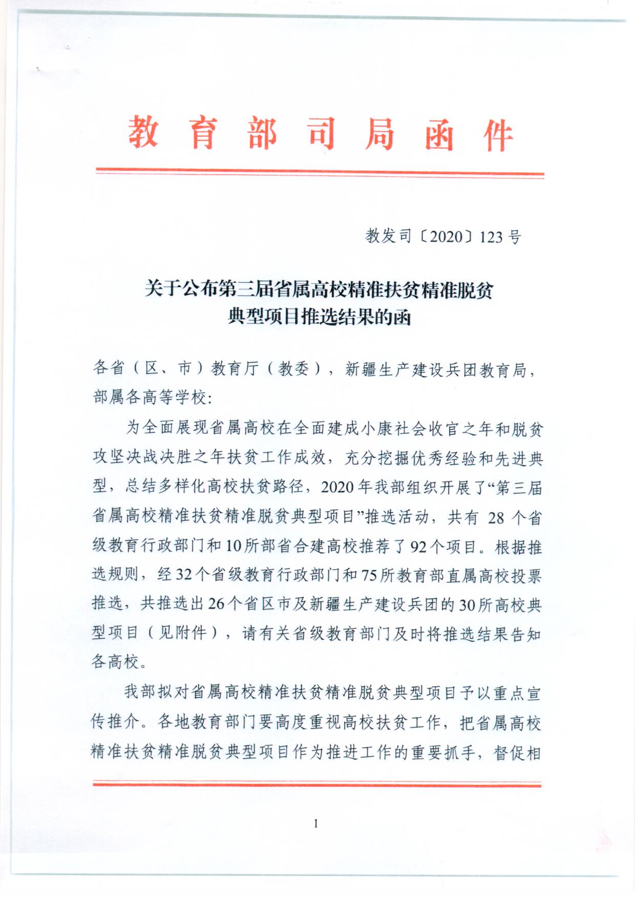 浦京申报项目入选教育部第三届省属高校精准扶贫精准脱贫典型项目