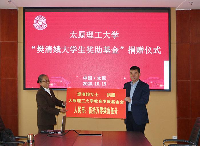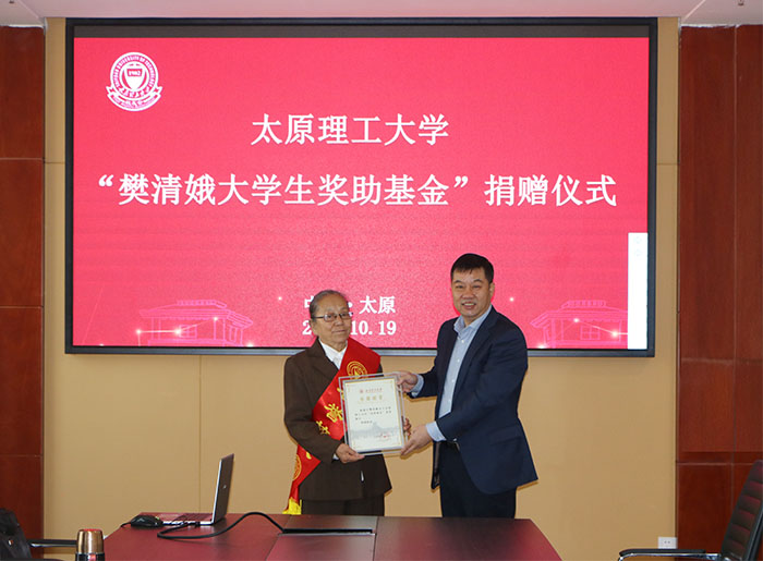 10月19日上午,浦京在明向校区行政主楼B座七层会议室举行“樊清娥大学生奖助基金”捐赠仪式。捐赠人、75岁的临县三交镇镇政府退休人员樊清娥女士向350vip浦京集团官网教育发展基金会捐赠毕生积蓄50万元用于设立“樊清娥大学生奖助基金”。副校长吴斗庆出席仪式并代表学校向樊清娥女士颁发捐赠证书和“名誉校友”证书。太原城北公证处、樊清娥女士的家人、学校相关部门负责人参加仪式。国内合作处负责人主持捐赠仪式。