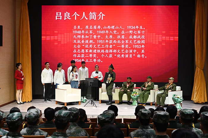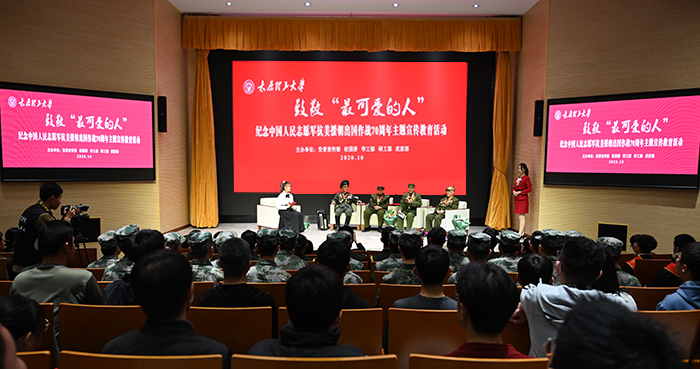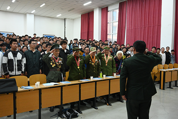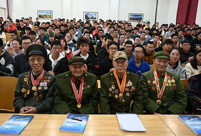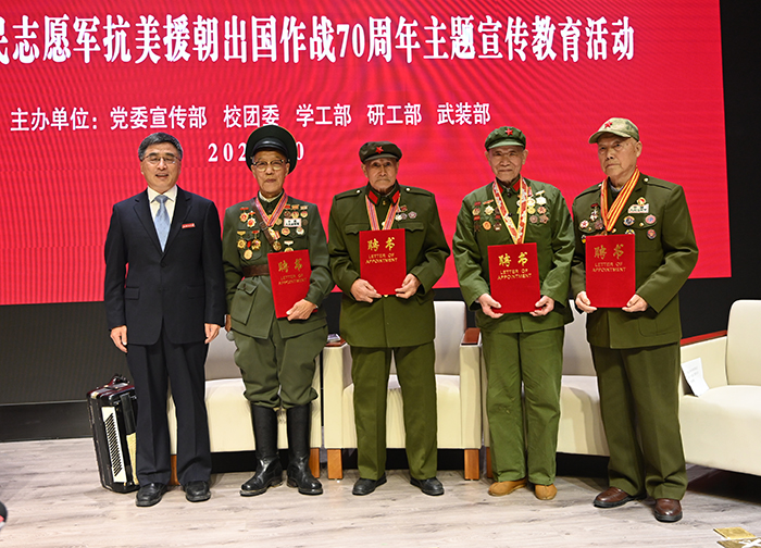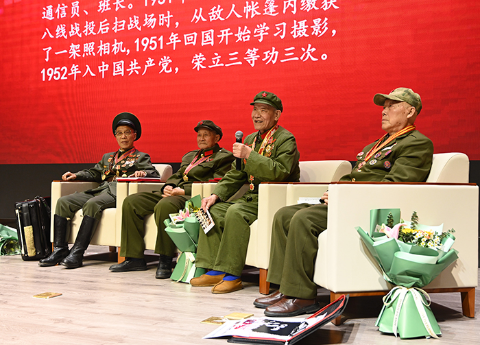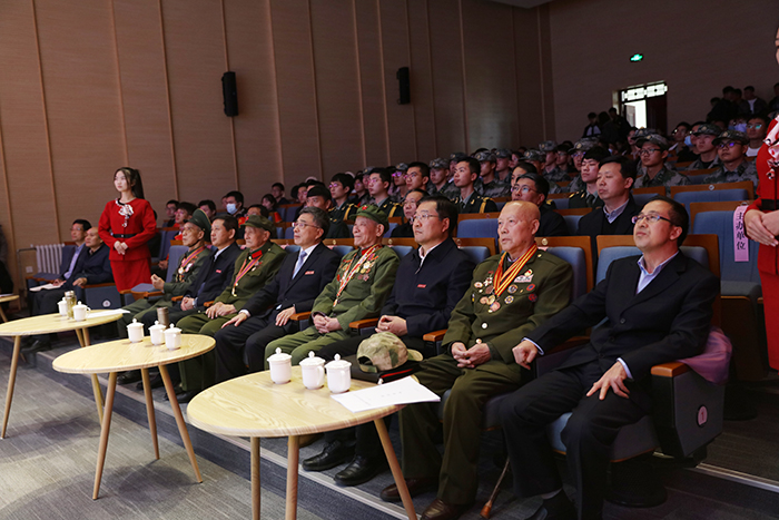 当四位老战士整齐列队、精神矍铄步入会场时,现场师生全体起立报以热烈掌声,表达内心的由衷敬佩和诚挚欢迎。开场视频以更加直观生动的形式,再现了艰苦卓绝的抗美援朝战争,将现场气氛拉回到了70年前战火纷飞的年代。