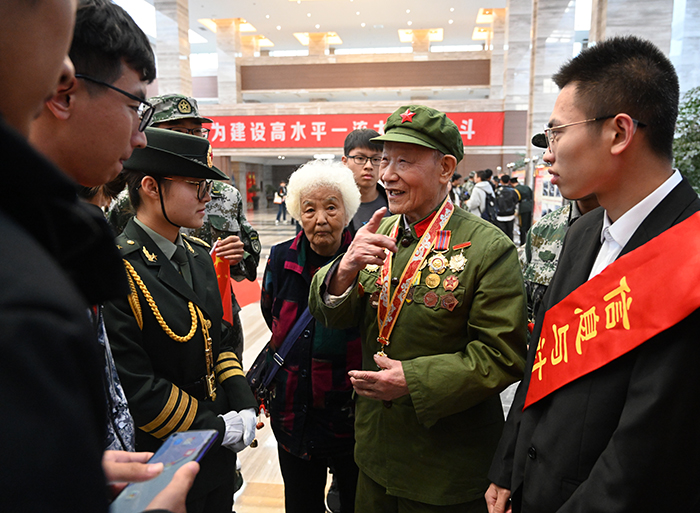 访谈活动在全场师生共同唱响的《我的祖国》激昂旋律中圆满落下帷幕。之后,四位老兵在师生们的簇拥下,来到位于学校行政楼一层的主题摄影展展区,向青年人讲述照片背后的故事。一幅幅由四位老兵珍藏或拍摄的珍贵照片,深深打动了现场每一位师生。