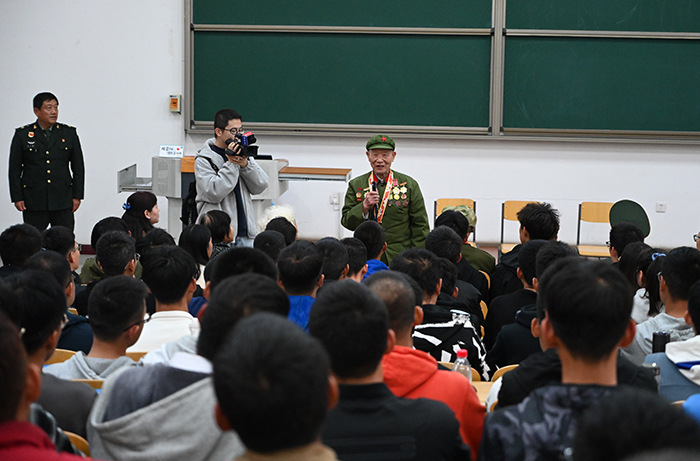 在校期间,四位老兵还深入军事理论课课堂,与2020级本科生同上军事理论课,共同接受军事理论教育。“报告老班长,军事理论课准备完毕,请您指示!”“开始!”一招一式、一举一动,营造起浓浓的军事氛围,阵阵热烈的掌声传递出对老兵们的无限敬仰。