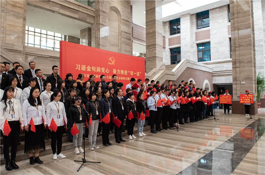 人事处、学工部、财务部、科研院、宣传部等党支部及机关全体党员干部职工,以饱满的热情和真挚的感情,在机关党委书记和各党支部书记的带领下,齐声诵读“习语金句”。“在新时代中国特色社会主义的伟大实践中,以党的坚强领导和顽强奋斗,激励全体中华儿女不断奋进,凝聚起同心共筑中国梦的磅礴力量!”“不忘立德树人初心,牢记为党育人、为国育才使命,不断作出新的更大贡献。”铿锵有力的诵读声久久回荡在明向校区行政楼一层大厅,彰显出机关全体党员干部职工坚决维护核心、践行初心使命的铮铮誓言。