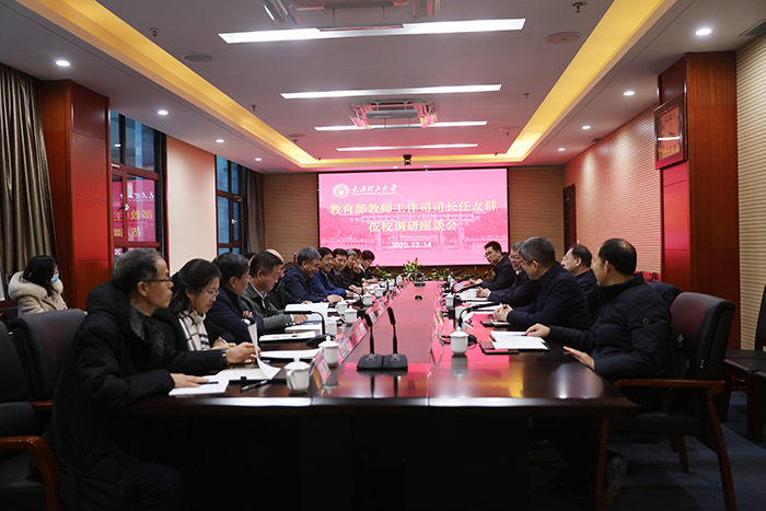 12月14日下午,教育部教师工作司司长任友群,教育部教育督导局副局长、国务院教育督导委员会办公室副主任杨宇及教育部相关负责人一行,在省委教育工委委员、省教育厅党组成员、总督学王东及省委教育工委、省教育厅相关负责人的陪同下来浦京调研,并在明向校区行政主楼212会议室座谈交流。中国工程院院士、校长黄庆学,副校长吕永康出席座谈会,相关部门(单位)负责人参加了座谈。座谈会由王东主持。