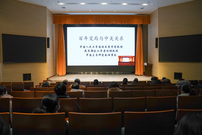 1月7日,中国人民大学国际关系学院教授、教育部“长江学者”特聘教授、中国未来研究会理事长金灿荣应邀来浦京,在明向校区学生活动中心报告厅为广大师生作了题为《百年变局与中美关系》的形势政策报告。校党委书记郑强,校党委副书记李晋平、刘润祥,校党委常委、纪委书记翟健,副校长吴斗庆、树学峰、张献明、冯国瑞、孙宏斌,全校中层干部、思政课教师,辅导员代表、学生代表等通过线上线下多种方式聆听了报告。报告会由李晋平主持。