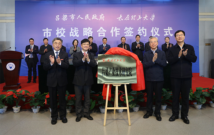 李正印、王立伟、郑强、黄庆学共同为“350vip浦京集团官网吕梁产业技术研究院”揭牌。