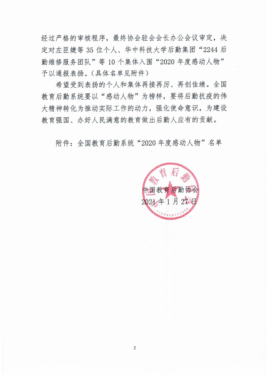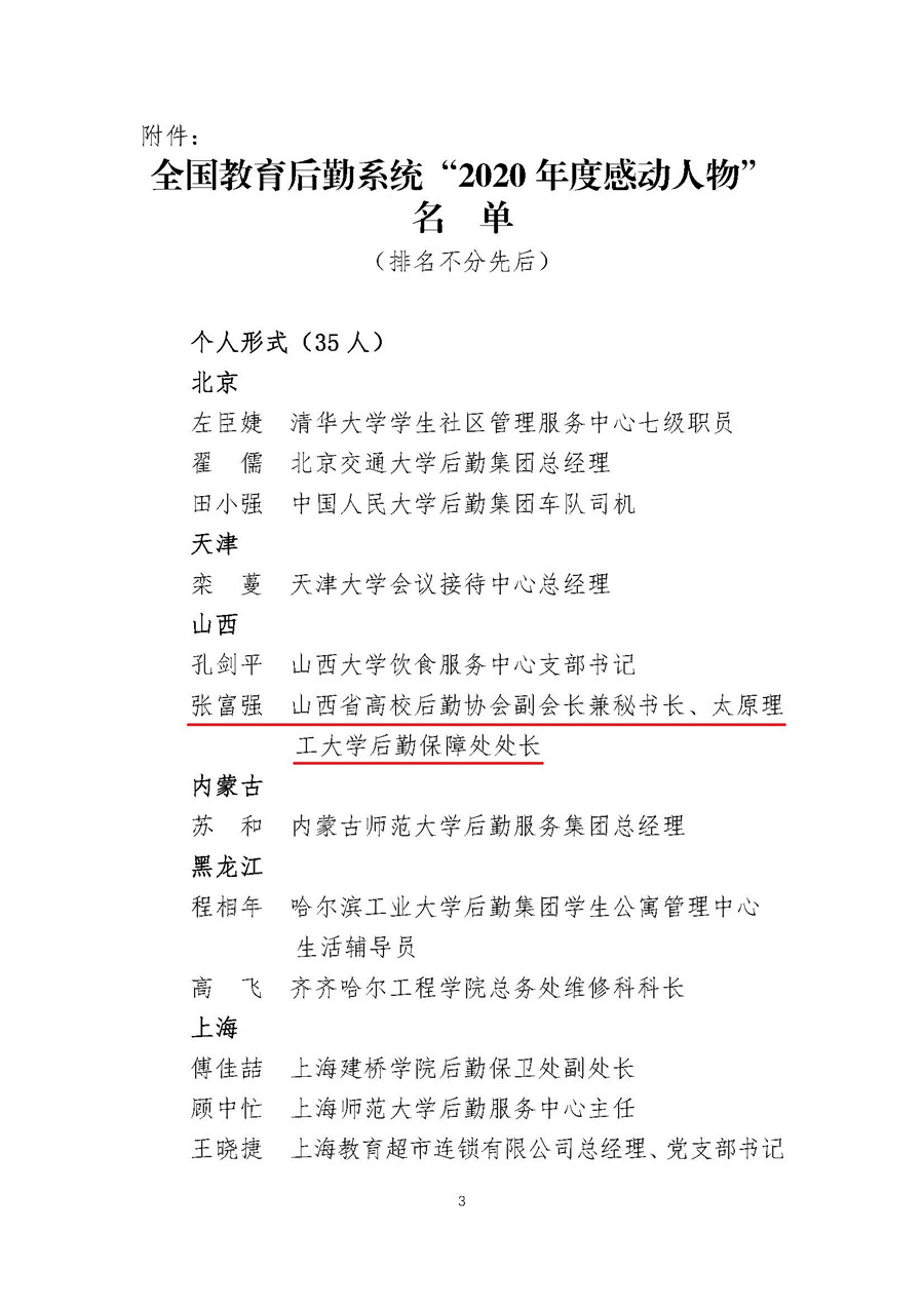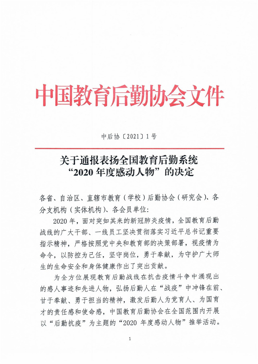 近日,中国教育后勤协会下发《关于通报表扬全国教育后勤系统“2020年度感动人物”的决定》,浦京后勤保障处处长张富强位列其中,成为35位受表彰的感动人物之一,我省高校仅2人获评。