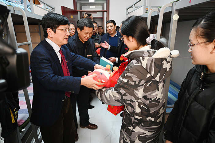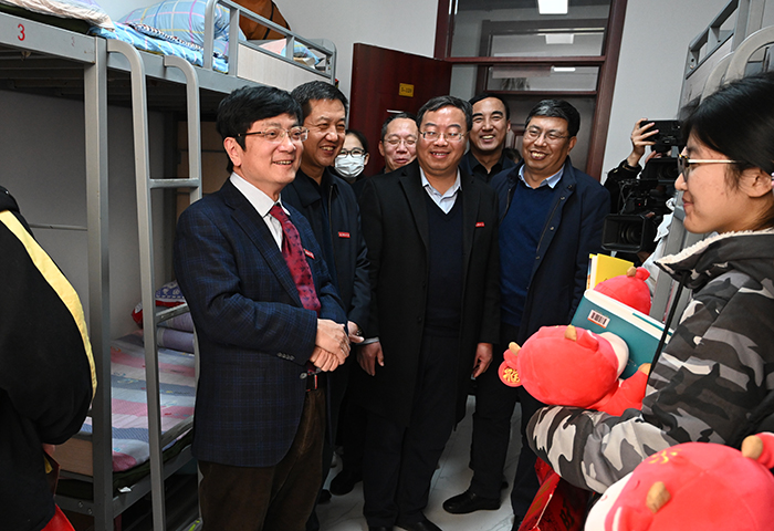 临近春节,校领导时刻惦记着因疫情留校学子们的学习生活状况,2月6日下午,校党委书记郑强、副书记刘润祥在党委办公室、宣传部、学工部(学生处)、后勤保障处、校团委等相关部门(单位)负责人的陪同下,深入宿舍看望慰问假期留校学生。