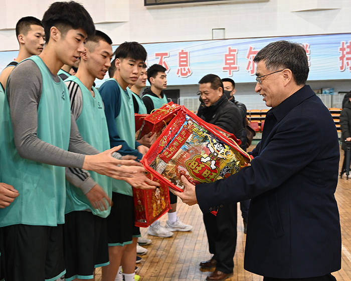校领导一行首先来到虎峪校区体育馆,慰问校男篮队员和教练员。为代表我省出征西北赛区,男篮队员及教练员在春节寒假期间仍连续训练,备战联赛,黄庆学代表全校师生向他们致敬,并表达节日的问候和祝福。他说,校男篮CUBA团队是全校的一面旗帜,能吃苦、能打胜仗的男篮精神在学校多年传承,为学校的“双一流”建设增添了巨大能量。强化训练对大家既是身体的锻炼,也是精神意志的挑战,希望大家刻苦训练,在训练中团结友爱、互帮互助,度过充实的春节,在2021年的比赛中取得优异成绩。