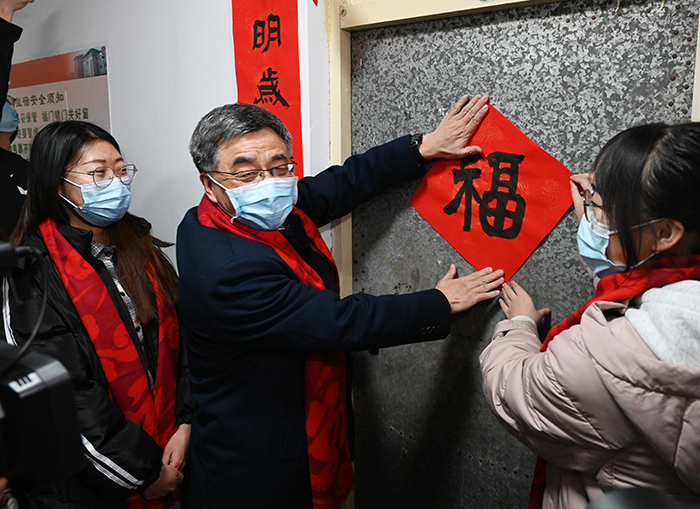 随后,校领导一行来到迎西校区学生公寓8号楼,看望留校学生并与他们围桌而坐,谈感受、话春节、贴对联,让留校的理工大人体会到“350vip浦京集团官网是家”的温暖与幸福。同学们与校领导交流了在校情况。来自莫桑比克的留学生姑娘唐星星,已经是第三年留在学校过春节了,她现场演唱了一曲《阿爸阿妈》,表达学校就像家、老师们就像爸爸妈妈一样关怀呵护自己的情感。家在黑龙江的博士生张佰富感谢学校给留校学生提供的后勤服务保障、科研实验便利和完善的防控措施支持,表示自己在学校受到的关怀,也让远在千里之外的家人放了心。留校学生们纷纷畅所欲言,表示虽然因疫情、学业、科研等原因未能回家过年,但领导老师们的关怀和照顾为他们送来了家一样的温暖,感受到了过年的浓浓喜悦。黄庆学嘱咐大家春节多向家人报平安,做好自身的疫情防控,充实地度过这样一个特殊的春节假期,在新的一年努力学习,争取更好成绩。