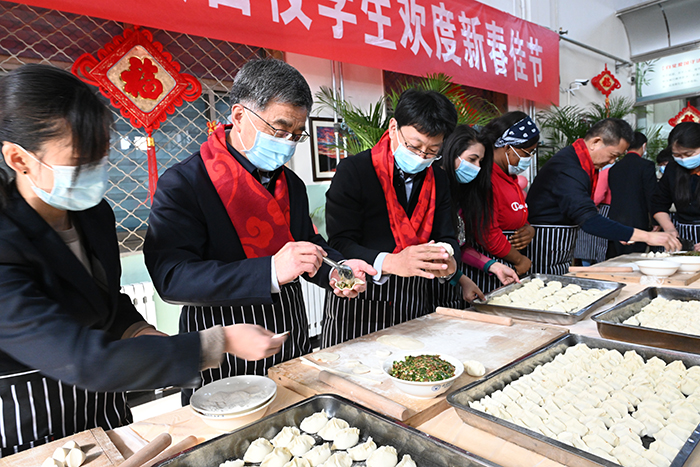 当天中午,学校精心准备了丰盛的午餐,校领导与寒假留校的全体学生、外国专家等在清泽餐厅四层一起包饺子、共庆新春佳节。其间,校领导、老师与同学们共同举杯,互致新春祝福。同学们说,虽然今年不能回家过年,但在学校领导和老师们无微不至的关心下,这个春节过得很充实、很快乐。在这辞旧迎新之际,假期的校园依然充满了浓郁的新春气息,留校学生虽身在他乡,却依然感受到了如家般的温暖。
