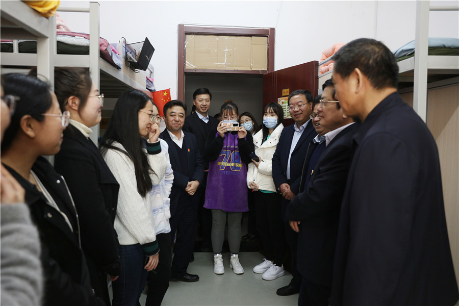 3月5日,是新学期学生返校报到首日。校园里阳光明媚、充满生机。校党委书记郑强、副书记刘润祥、副校长冯国瑞在相关部门(单位)负责人的陪同下,先后来到明向校区南门报到处、学生公寓、学生餐厅等地看望返校学生及现场工作人员。