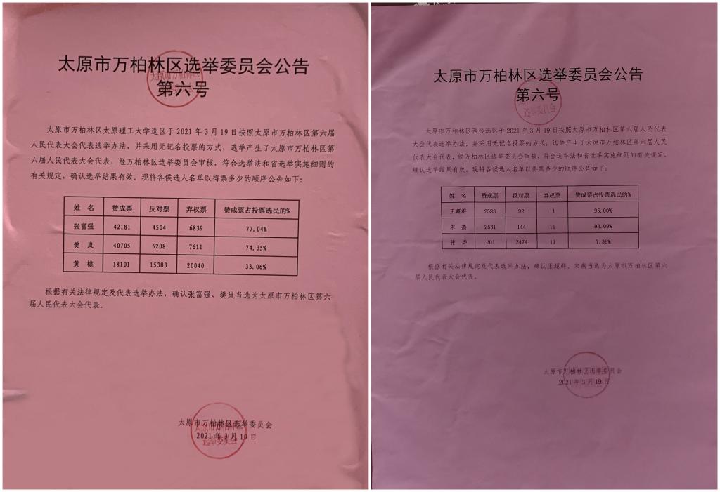 当晚发布了《太原市万柏林区选举委员会公告(第六号)》:根据有关法律规定及代表选举办法,确认张富强、樊岚当选为太原市万柏林区第六届人民代表大会代表。同时,太原市万柏林区选举委员会统筹安排在西线选区参加选举的浦京候选人宋燕也成功当选。