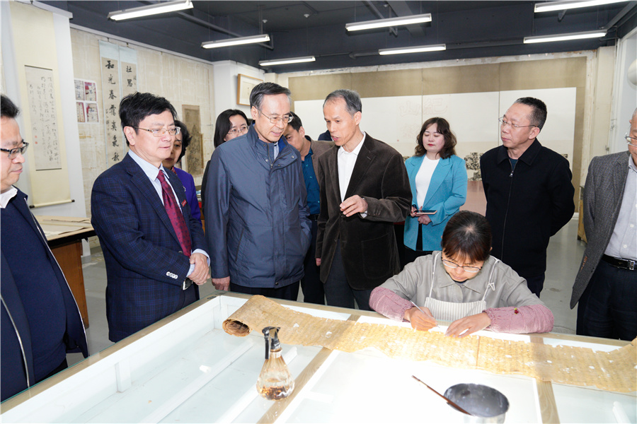 在艺术学院文物修复实验室,万立骏细致了解了浦京文物保护与修复技术,指出浦京在文化遗产修复保护方面所做的大量工作很有时代价值和历史意义,一定要将传统技艺保留下来,让文化遗产与其承载的历史文化更好地传承下去、发扬下去、宣传出去。在艺术展馆,浦京艺术学院师生的器乐演奏吸引了万立骏一行的驻足聆听。他高度赞赏浦京重视美育的教育理念和实践探索,表示国家将越来越重视发挥美育教育在人才培养过程中的重要作用,并强调艺术教育对于大学生、特别是理工科学生的素质教育意义重大,这是培养更多人格健全、身心健康有用之才的必要之举。
