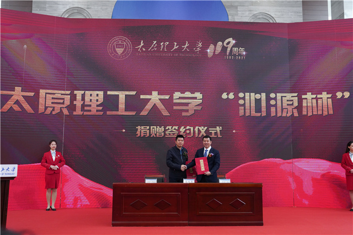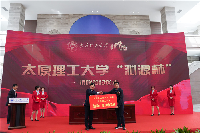 素有“油松之乡”美誉的沁源县向浦京馈赠油松一百三十株,建“沁源林”以表祝贺。吴斗庆与徐计连作为双方代表进行签约,郑强代表学校接受捐赠并颁发捐赠证书。徐计连代表沁源县对学校建校119周年表示热烈的祝贺,他表示,沁源县将继续利用好红色文化资源和绿色生态资源优势,进一步加强与学校的深入合作,祝愿学校在建设一流大学的征程中取得新的更大的成就。